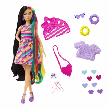 מארז ברבי בסדרת BARBIE TOTALLY HAIR מבית MATTEL. המארז כולל בובת ברבי עם שיער חלק וצבעוני באורך כ-22 ס"מ, שמלה אופנתית וצבעונית בהדפס לבבות, מסרק ומגוון אביזרי שיער ואופנה.